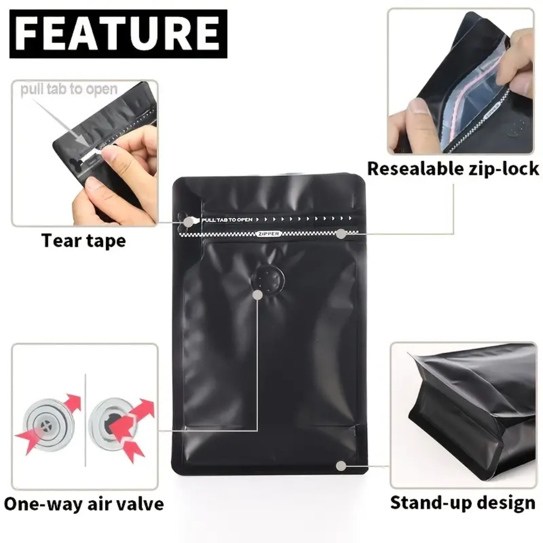 Professionally designed aluminum metalized stand-up pouches featuring side gusset and flat bottom construction for superior stability. Each pack includes 10 reusable bags with convenient side windows for product visibility. Ideal for coffee bean storage, these pouches maintain freshness while allowing customers to view contents. Perfect for specialty coffee retailers seeking premium packaging solutions with both functionality and presentation appeal.