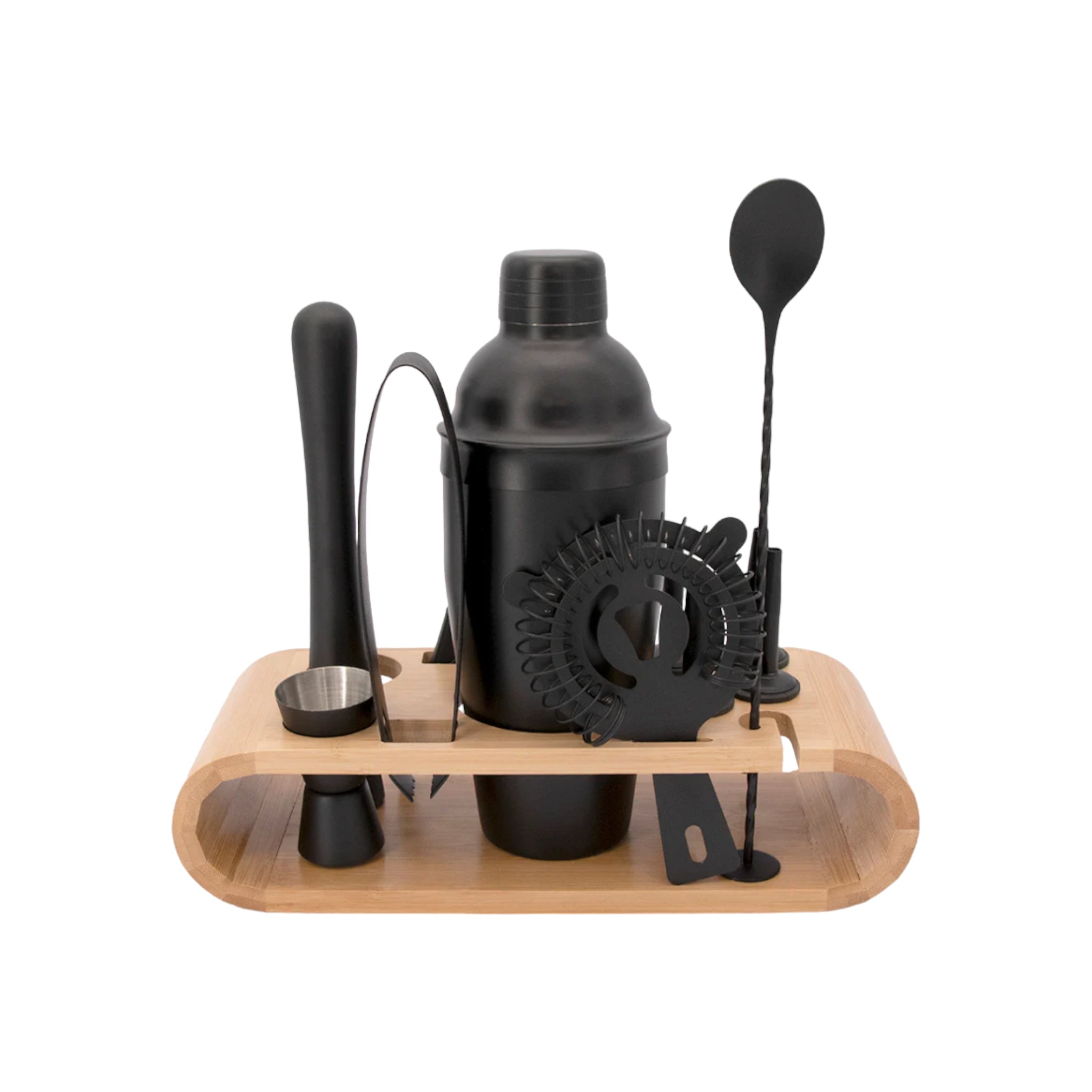 - Our trendy portable 12-piece matte black cocktail set in a bamboo caddy includes the ideal accessory kit for any cocktail lover.