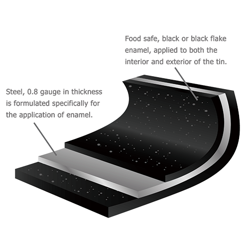 - Enamel on steel is fused with heavy gauge steel
