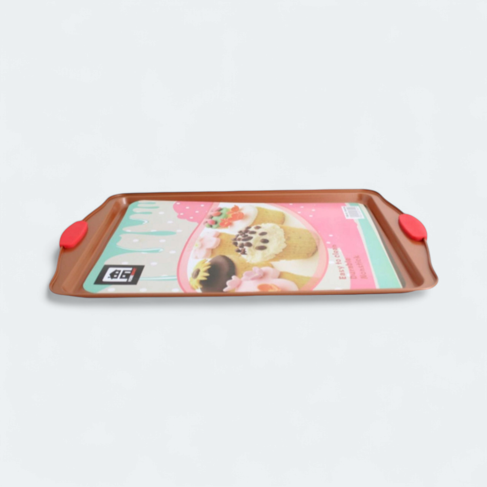 - Non-stick cookie sheet perfect for baking with red heat resistant silicone grip making it easy to carry. Comes with a elegant copper finish.