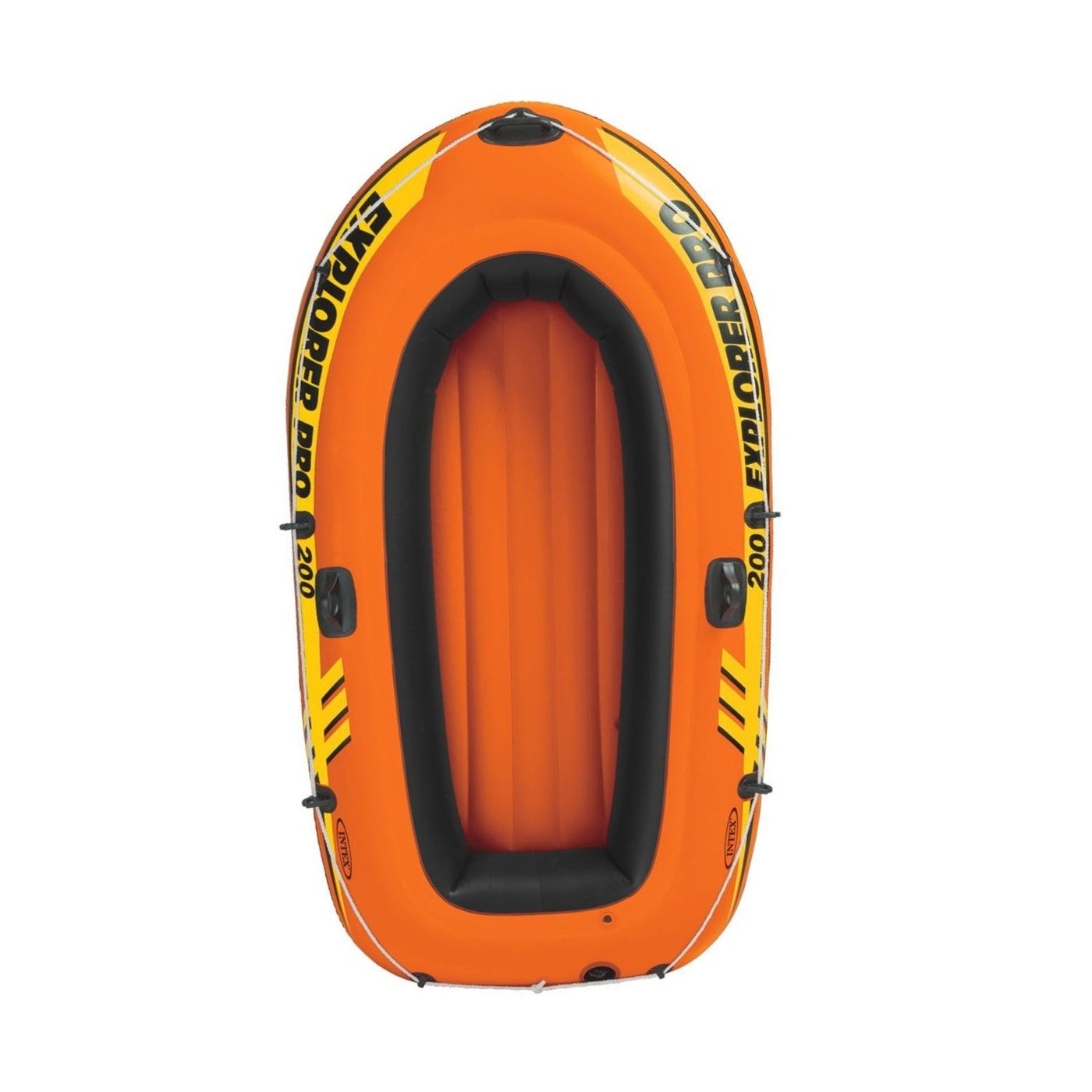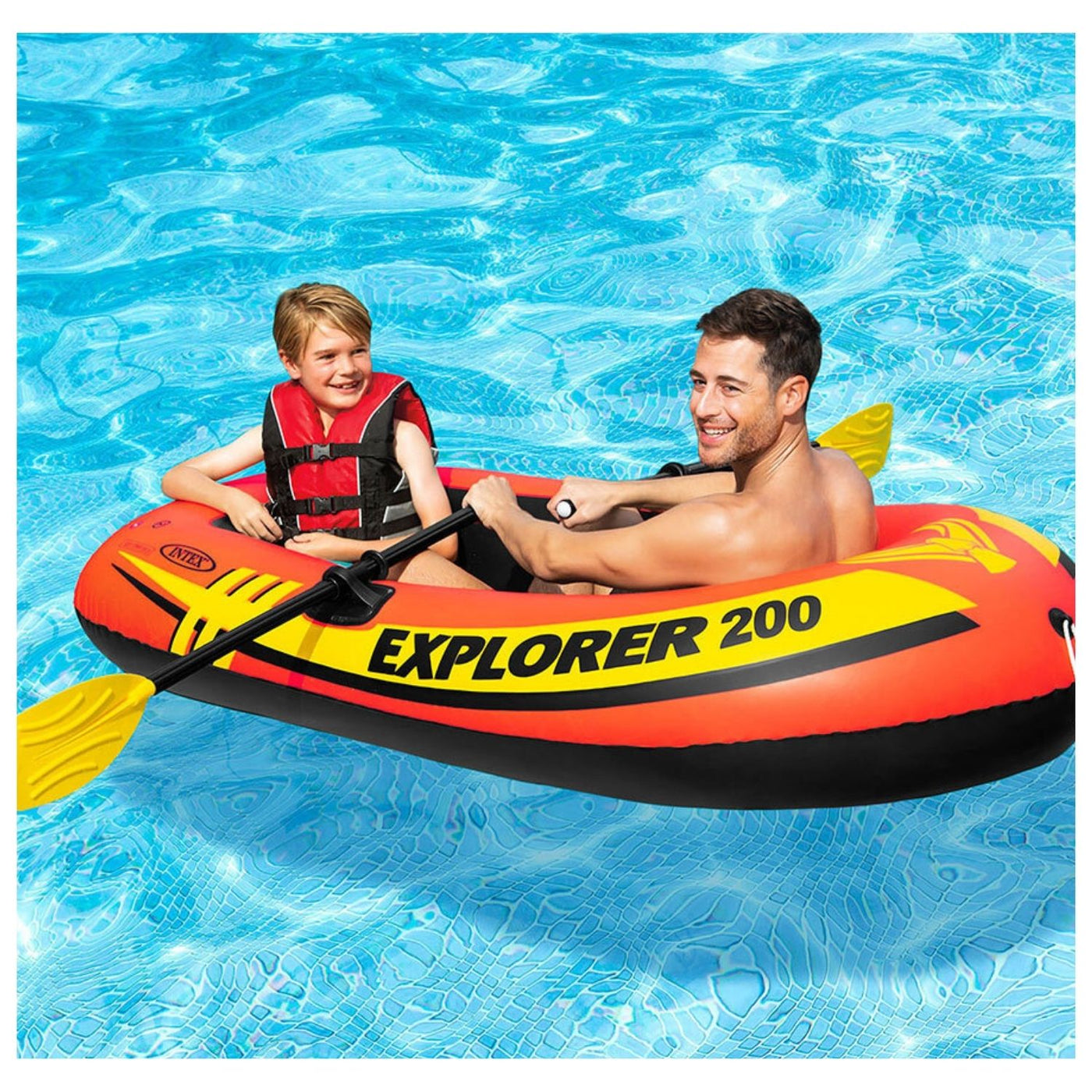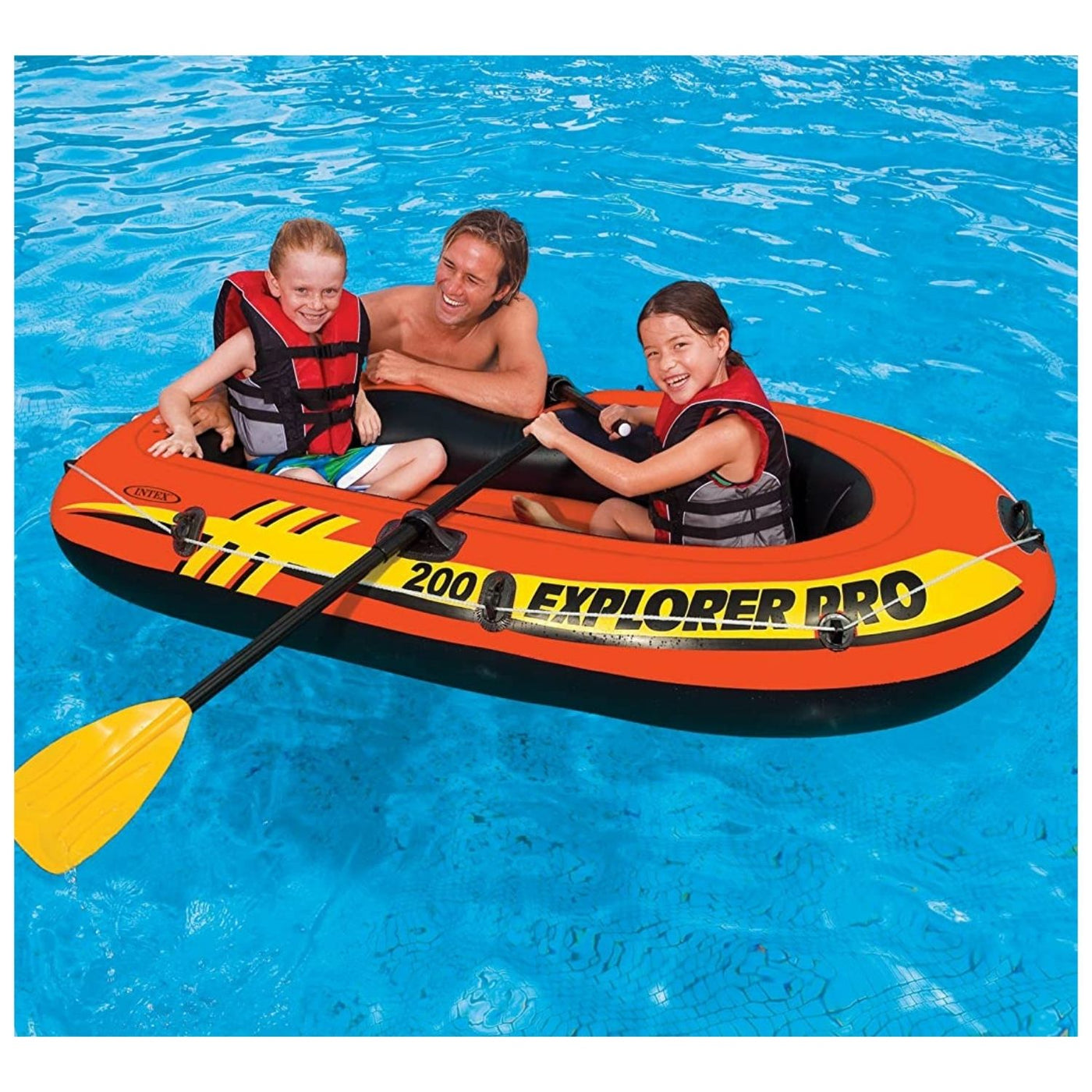 The Explorer Pro 200 inflatable boat makes cruising around the pool fun for two people. Designed for comfort and rigidity with an inflatable I-beam floor, this boat has three air chambers including an inner auxiliary chamber inside the main hull. A grab handle on the bow and an all-around grab line are provided for your convenience, as well as welded oar locks. Also included is a U.S. Coast Guard I.D., a repair patch, two 48” French oars, and an Intex high-output hand pump for easy inflation and deflation.